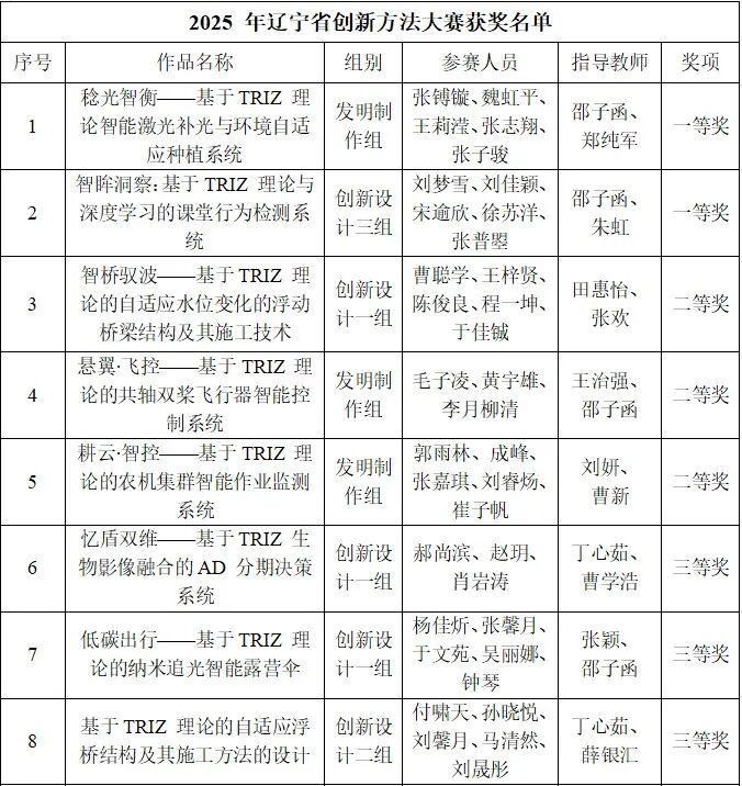 近日,由辽宁省科学技术协会等单位主办的2025年辽宁省创新方法大赛圆满落幕。本届大赛竞争激烈,吸引了全省众多高校和企业的顶尖创新团队同台竞技。经过多轮严格评审,我校学子凭借出色的创新能力和扎实的专业功底,在比赛中夺得一等奖2项、二等奖3项、三等奖10项的优异成绩,充分展现了我校在创新创业教育方面的雄厚实力!